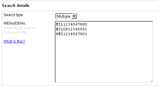 To search for multiple WENs at once enter the WEN numbers seperated by a space.
